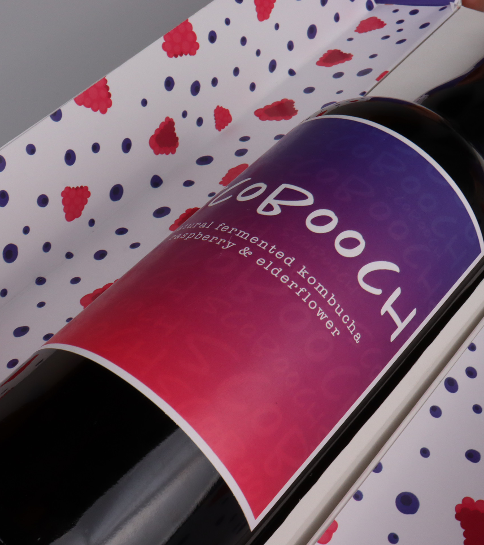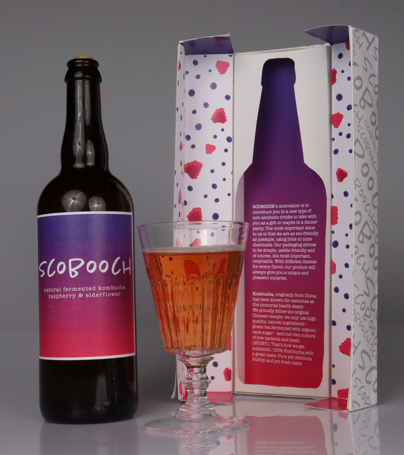 This is for a packaging competition called ‘PIDA’. We decided for a premium kombucha. We wanted to stand out on the beverage market as a luxurious alternative to alcohol. The outside of the box is minimalistic, monotone and luxurious while the inside is bubbly, colorful and eye-catching. The fruit-pattern on the inside are illustrated by me and the pictures of the final product were taken by me.